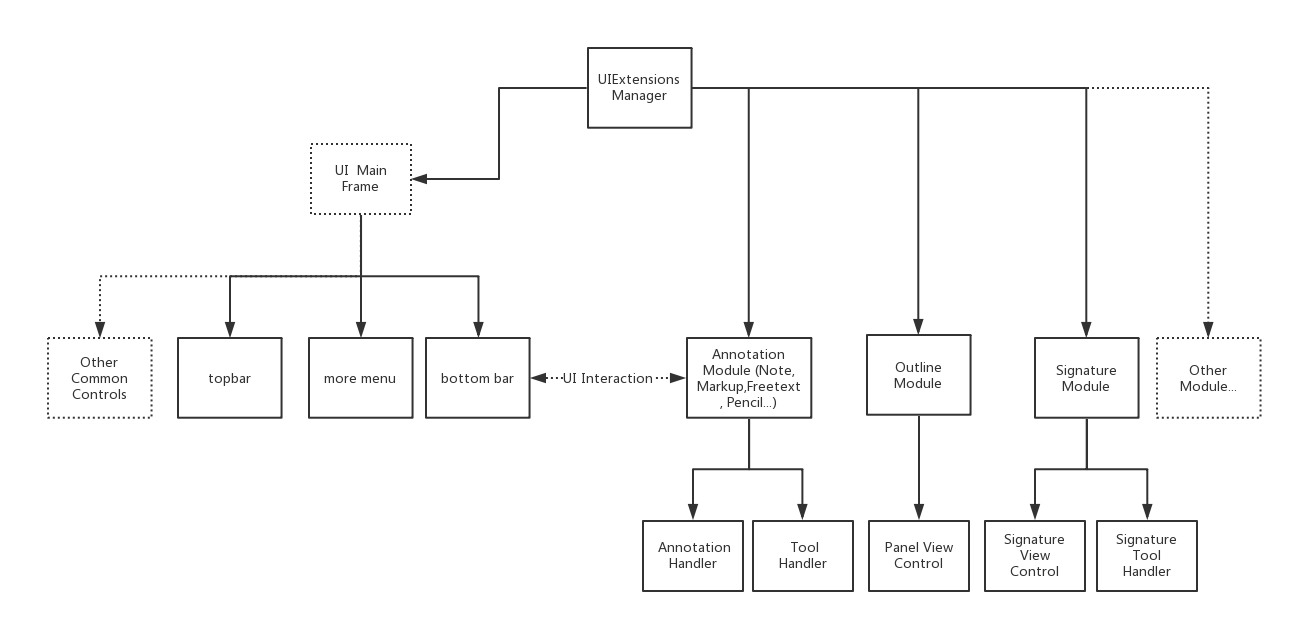 UIExtensionsManager contains the main-frame UI, such as top/bottom toolbar, and other UI components which are shared between each module. Meanwhile, through UIExtensionsManager, each feature module can also be loaded separately. And when loaded, the feature module will adapt and adjust the main-frame UI, as well as establish the connection of message event response. Each feature module may contain its module-specific UI components, and have its self-contained message event handling logic. UIExtensionsManager will also be responsible for distributing messages and events received from View Control component to each feature module. The following figure shows the detailed relationship between UIExtensionsManager and modules.