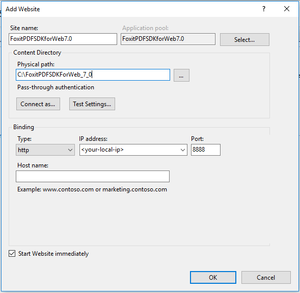 - On the ‘Add Website’ dialog, please add your website detail and browse the content directory to where your Foxit PDF SDK for Web folder is located. Also, select your local IP.