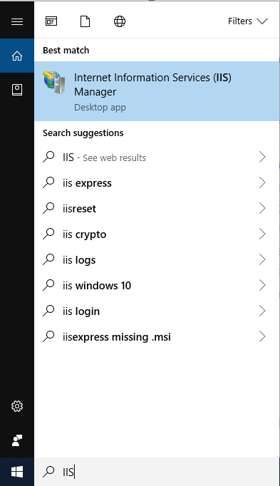 - Once you have IIS set up and running, go to your Start menu and search for ‘IIS’, you should be able to see ‘Internet Information Service Manager’ application.
