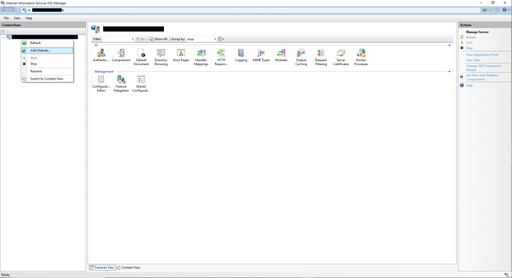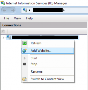 - On the IIS Manager Control Panel, click on your device in the top left and select ‘Add New Website’