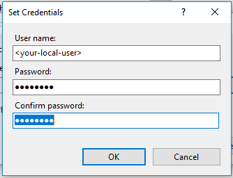 - Select ‘Specific User’ and click on ‘Set…’. In this field, add the local user name of the machine and login password.