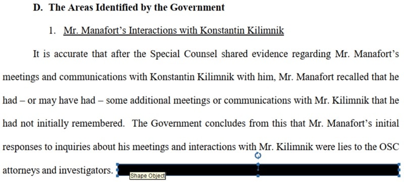 Recently, in a court document filed by Manafort’s lawyers, sensitive content was improperly redacted. The team, or possibly the Department of Justice, added a black box over the text, leaving the text items visible under the shape (and therefore in the source code too). This means that you can easily open the document, delete the black box, and reveal the sensitive information.